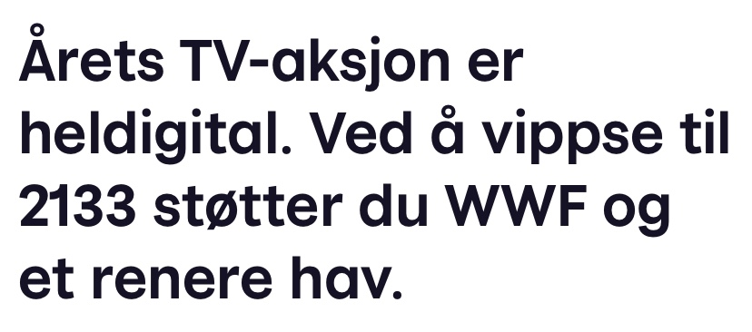 Før eg sluttar av for denne helga, vil eg minne om at TV-aksjonen 2020 går til WWFs kamp mot plast i havet. Det hamnar åtte millionar tonn plast i havet kvart einaste år. Plasten er ein trussel mot både dyrelivet og oss menneske.