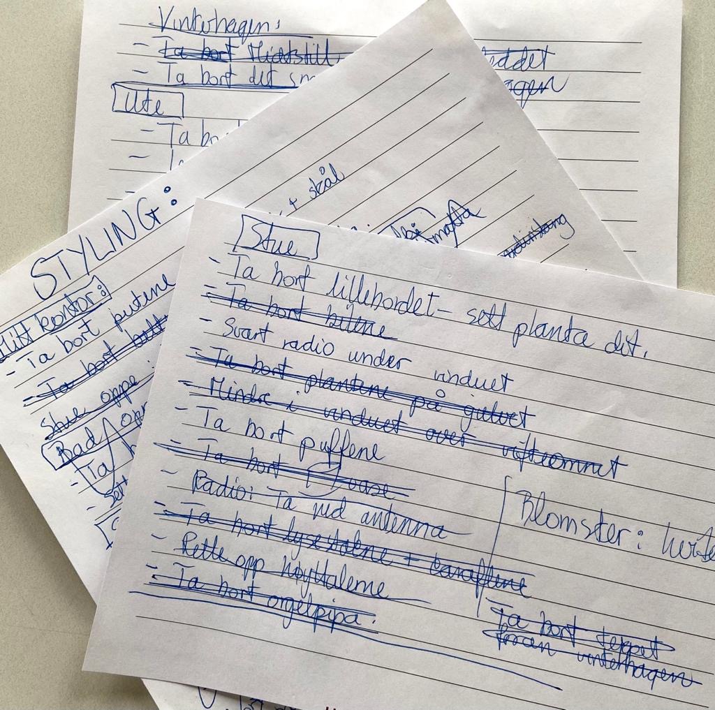 Onsdag kom det to triveleg damer. Dei gjekk gjennom rom for rom og kommenterte medan eg gjekk etter og noterte. Sjølv om eg følte at eg hadde reinska huset for alt som kunne kome i vegen for å vise fram eit hus, vart lista ganske lang.