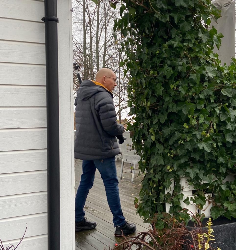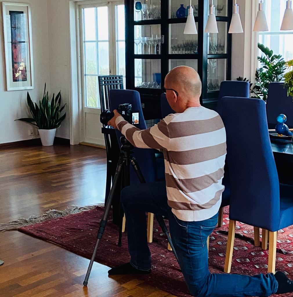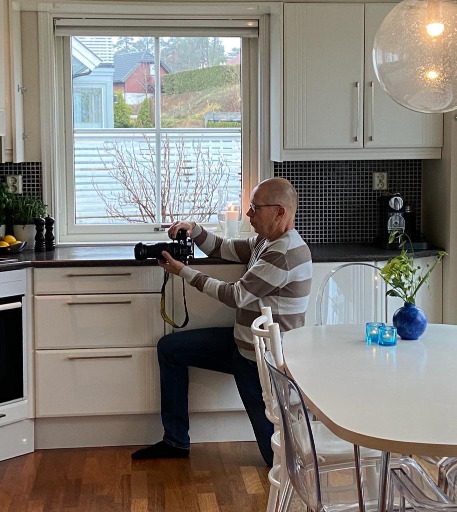 Fotografen var ein triveleg kar med god sans for humor, og dei to timane han var hos oss var ikkje kjedelege i det heile tatt. Dessutan fann han seg i at eg lista meg rundt og fotograferte fotografen. Her er boligfotograf Kristian T. Bollæren i aksjon: