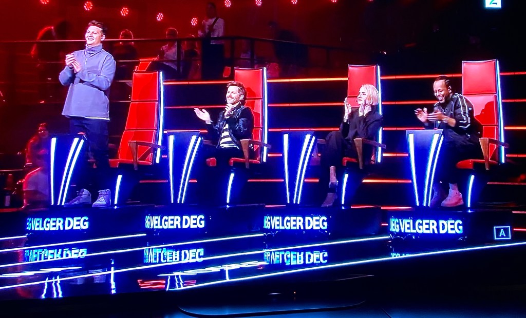 Programmet heiter The Voice. Eg elskar det, men eg får lyst til å riste fleire norske ord inn i desse mentorane, – i alle fall i to av dei. Eg veit at dei har vore mykje i det store utlandet og hatt suksess der, men er det verkeleg naudsynt med all denne engelsken?