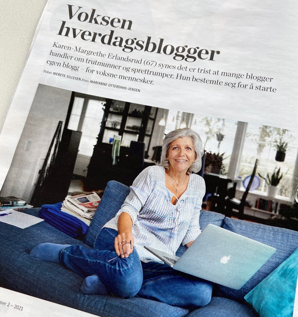 Du store all verda; eg og bloggen min er eit nyhende. I «Pensjonisten» nummer 2/2021, som låg i postkassa vår torsdag morgon, er ei av overskriftene «Voksen hverdagsblogger». Det er så lenge sidan eg hadde vitjing av journalisten frå «Pensjonisten» at eg nesten hadde gløymt heile greia.