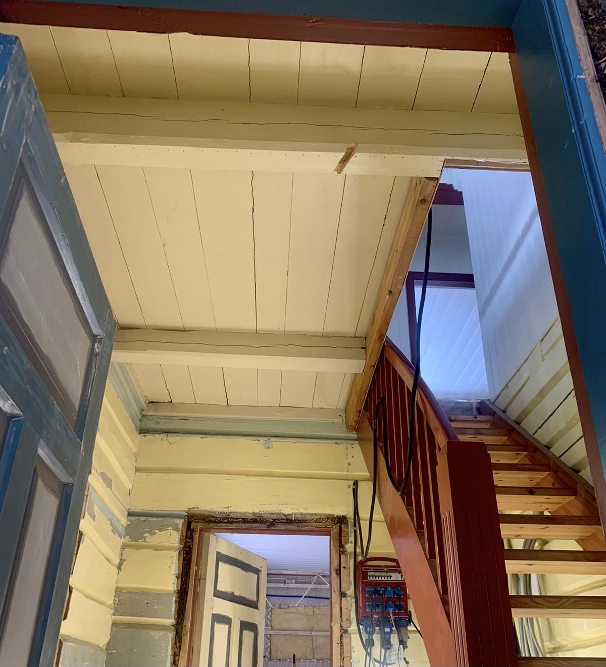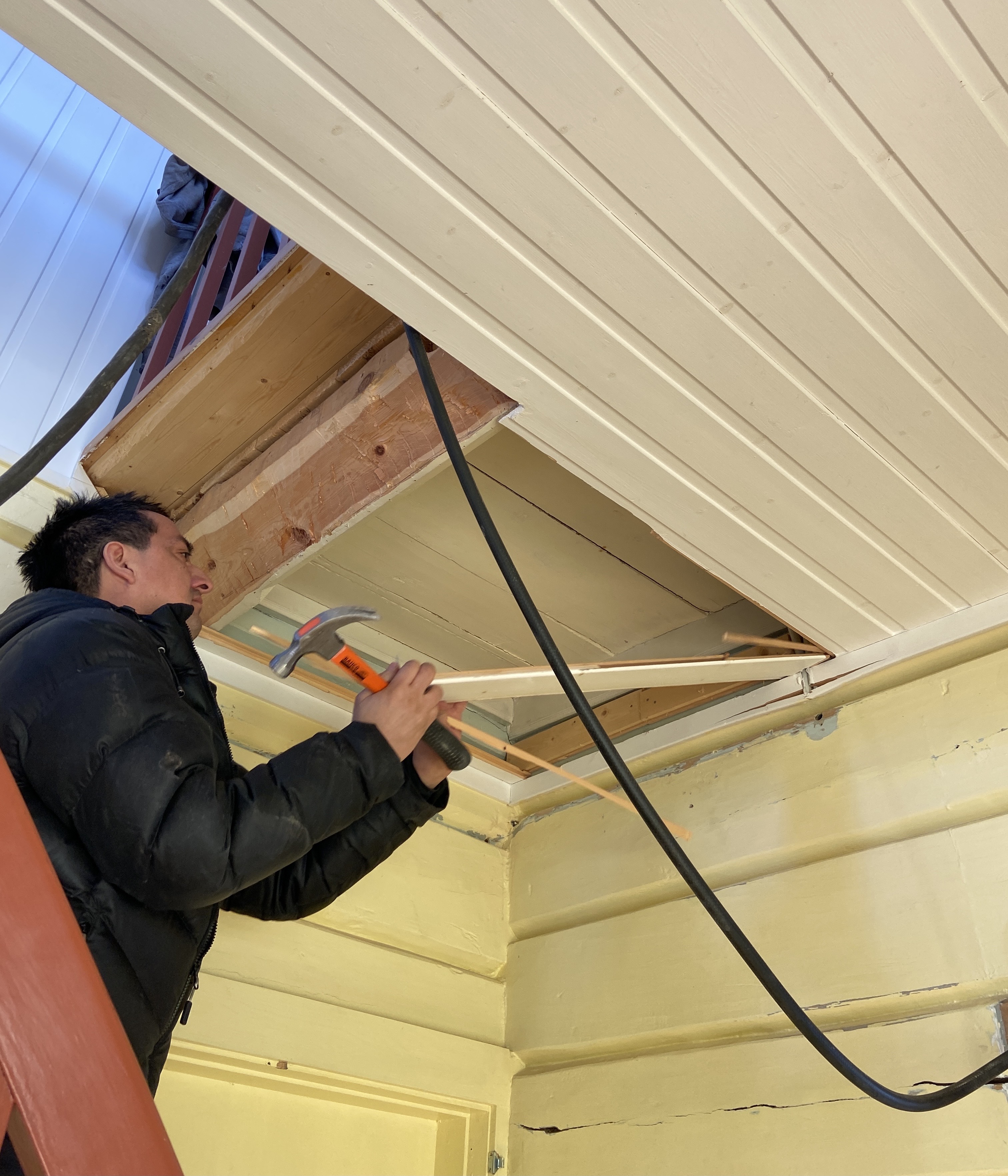 Før eg sluttar av for denne helga, må eg vise fram eit av dei siste funna i det fine, gamle huset vårt. Lars Andre, entreprenøren vår, ville finne ut korleis det såg ut under taket i inngangspartiet. Der dukka det gamle, vakre taket fram.