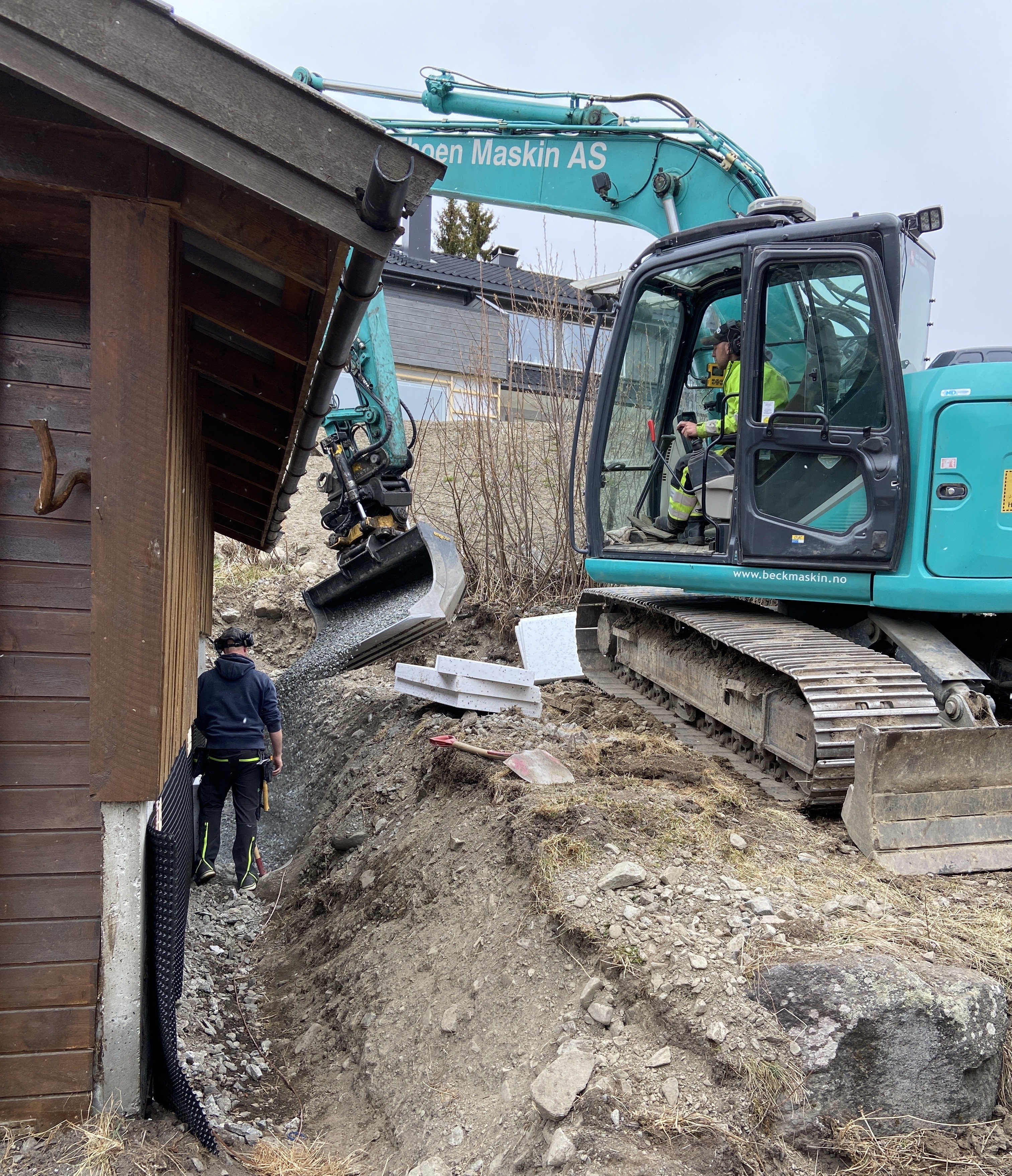 Me fekk god hjelp med uteområdet då Øyvind Thoen kom med gravemaskin og traktor. Då han hadde gjort jobben sin, såg me ljosare på å ta fatt på arbeidet med å få til eit område rundt huset der me kan trivast i åra som kjem.