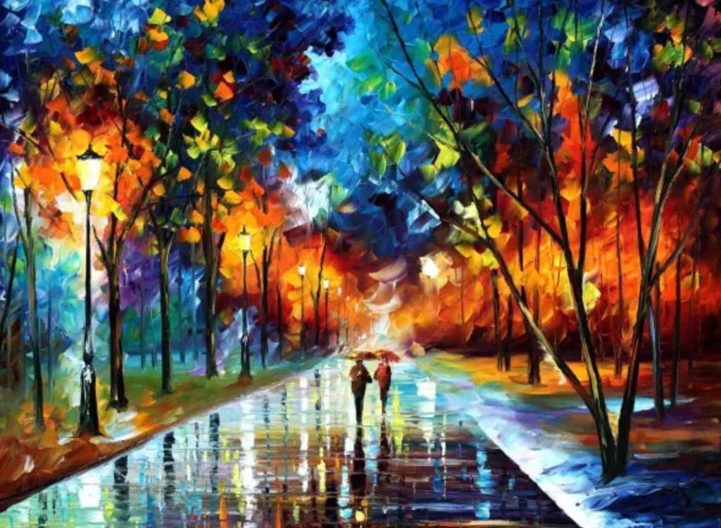 Overgangen frå interiør til kunst, fall meg ganske naturleg då eg skulle skrive vidare. Kontrastar i kunst kan vere morosame, vakre, interessante, foruroligande og rett og slett provoserande. Store kontrastar skapar dramatikk. Eg har valt meg ut to eksempel. Fyrst eit av Leonid Afremov. Ved å bruke dei kalde fargane blå og grøn saman med dei varme gul, raudt og orange, har han fått fram både avstand, nærleik og skugge.