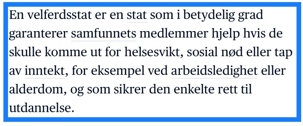 Dersom eit menneske skal kunne ha kontroll på eige liv, må hen også ha kontroll på rammene for livet sitt. Det er det ingen som kan vere sikre på at dei alltid vil kome til å ha. Derfor treng me ein velferdsstat som gjer at verda ikkje blir fullt så urettferdig.