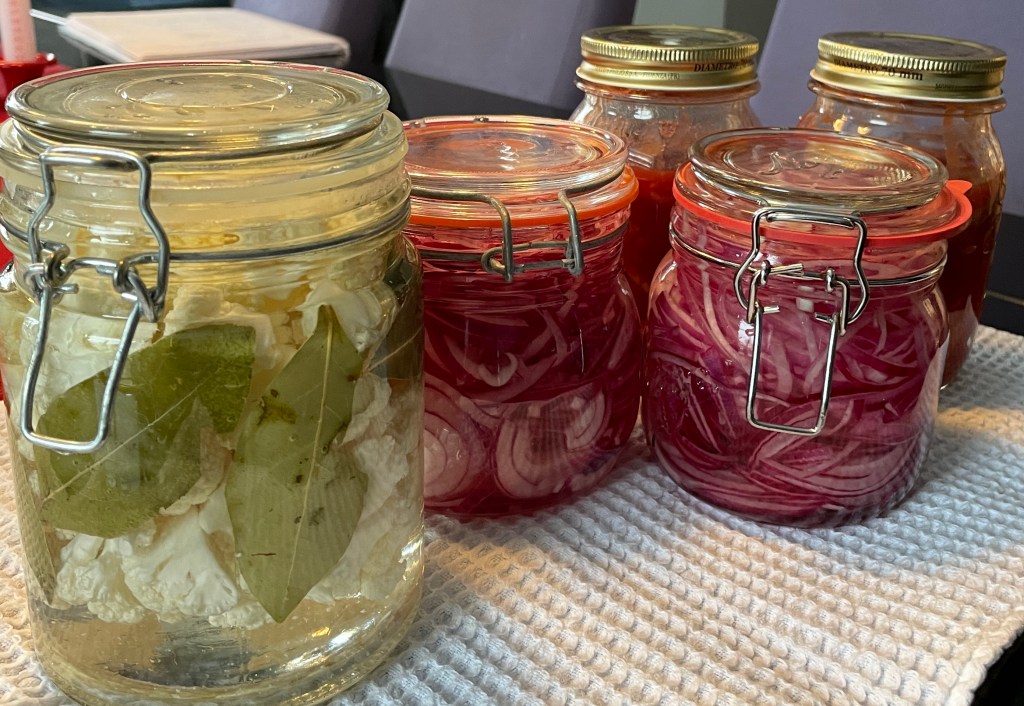 Tomatsild, blomkål-pickles og nedlagt raudlauk er ferdig på glas.