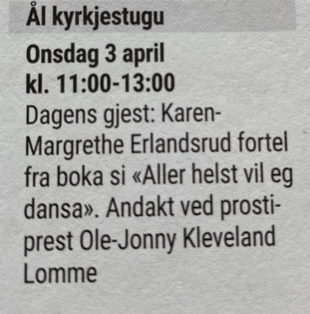 3. april skal eg vitje Kyrkjestugu på Ål. Det har eg aldri gjort før. Eg spurde diakonen om ein måtte vera spesielt kristen for å koma dit. Ho lo litt då ho svarte at «nei, slett ikke. Her er det opent for alle«. Så dersom einkvan vil ha ei litt utvida lunsjpause, er dei hjarteleg velkomne.