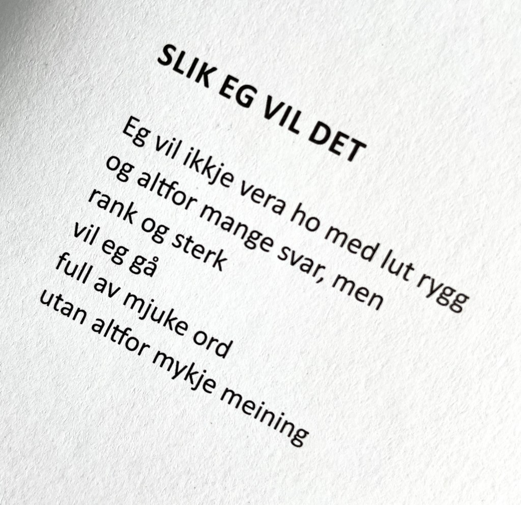 Diktet over er henta frå boka mi «Aller helst vil eg danse». Er det slik at når me blir eldre, blir me mindre og mindre opptekne av å meine så mykje fordi det blir meir og meir viktig å ha gode dagar utan for mange problem og konfliktar?