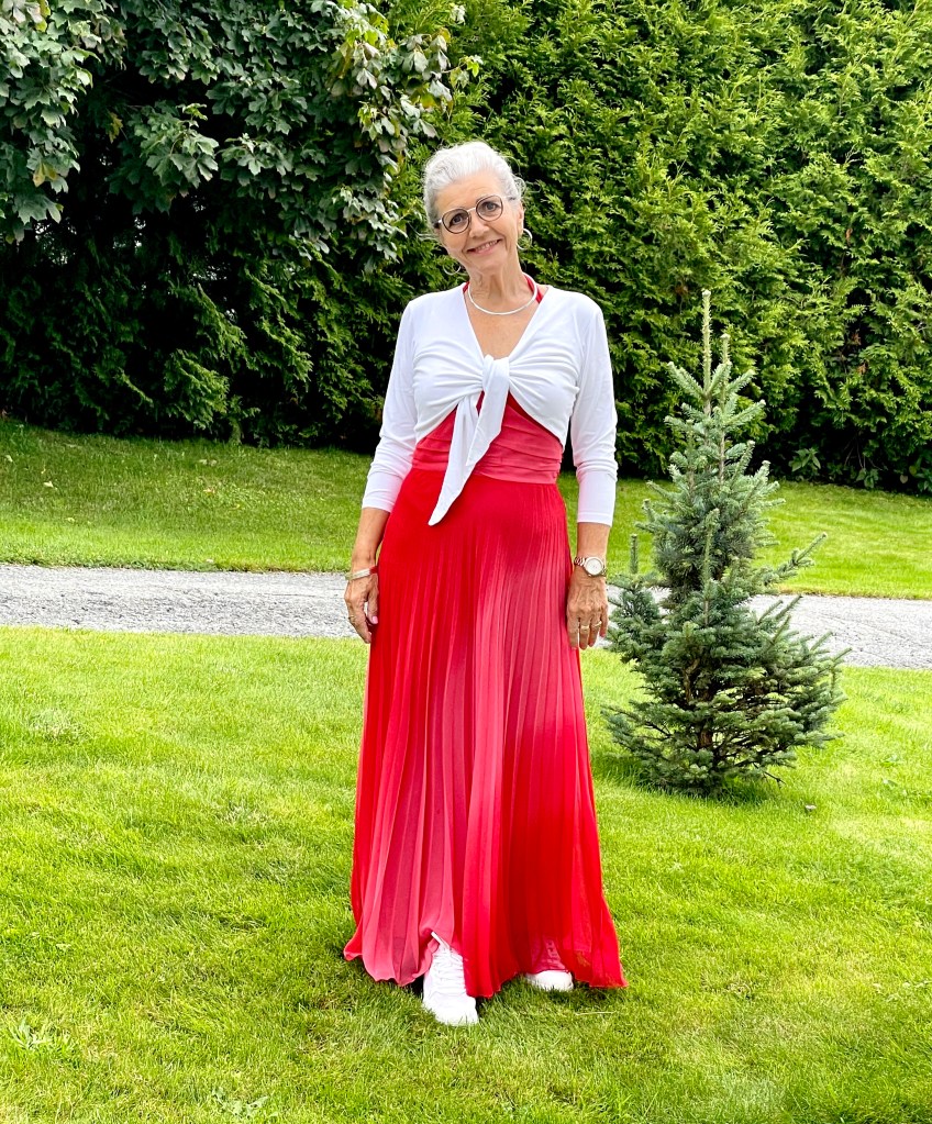 Her er eg i finkjolen min (og med joggesko) på veg til Operalåven. Der var det strålande, framifrå og stor stas, – og det er heilt sant.