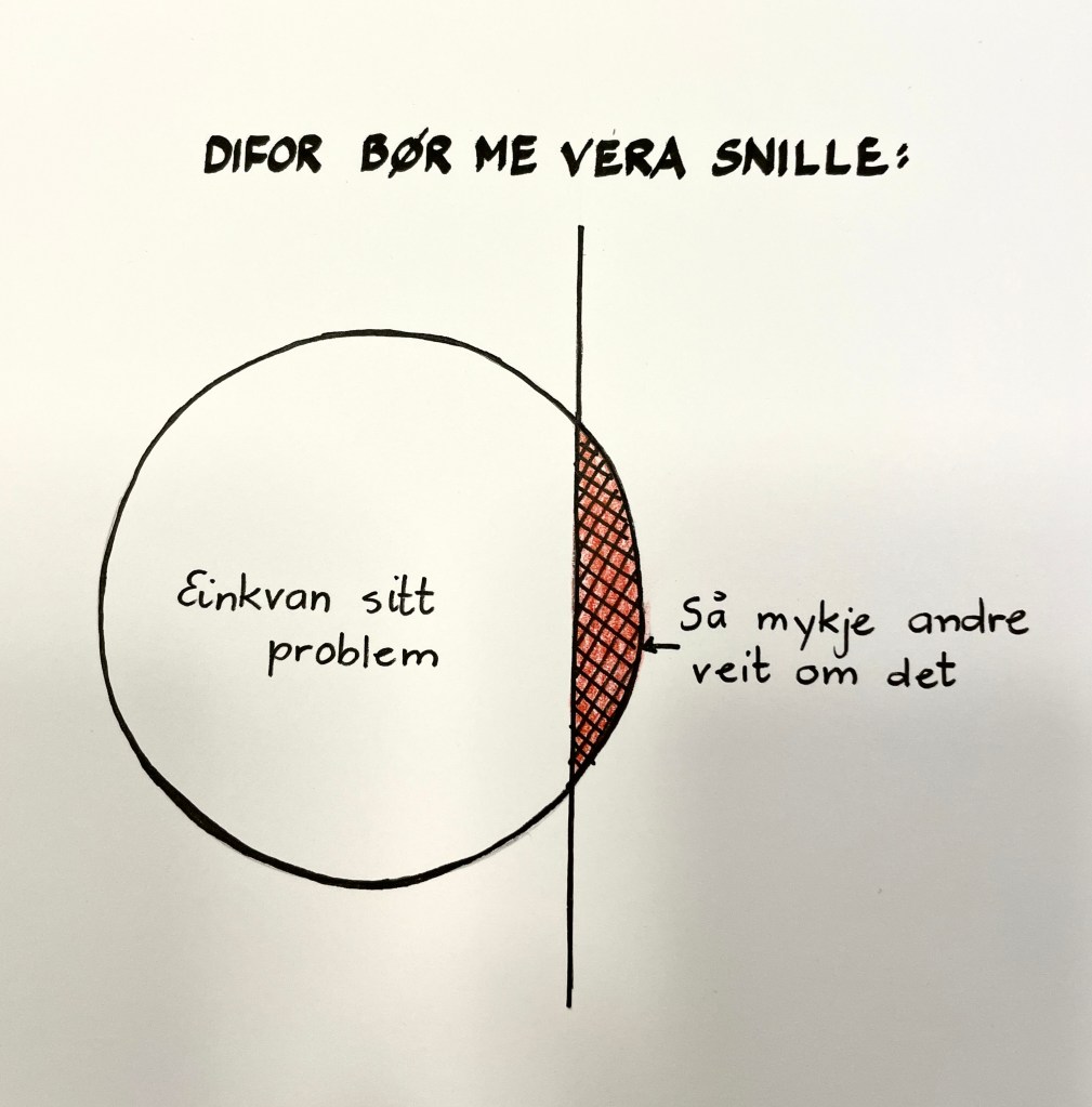 Når me hastar fram kvar for oss i eige liv og tenkjer på våre eigne kampar, er det lett å gløyme at på innsida kjempar alle dei me møter sin eigen kamp. Difor må me prøve så godt me kan å vera snille mot kvarandre.
