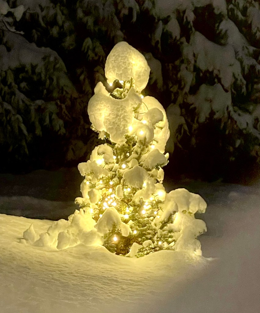 Før mildvêret kom på vitjing til oss her på Austlandet, hadde snøen pynta så vakkert langs alle vegar og rundt alle hus. Den vesle julegrana vår, som me planta for fire år sidan, stod så kvitpynta og vakker.